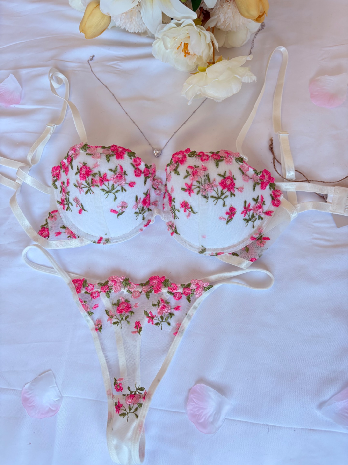 "Senti-me poderosa assim que vesti o meu conjunto Petal Blush. O tule é delicado e o ajuste é perfeito. É difícil encontrar peças que unam conforto e sensualidade!" — Braga